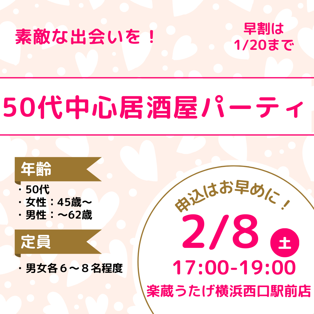 【50代中心】AIマッチング&お気に入りマッチングパーティ ★早割中(7月31日まで)・男性:50~63歳 ・女性45歳~59歳